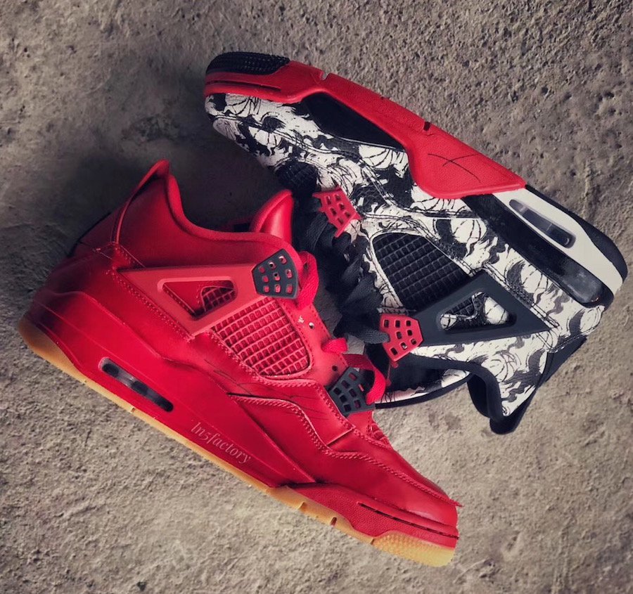 La seconde paire mise à 100 % sur le rouge . La couleur est présente sur l’ensemble de la chaussure à l’excepté des oeillets qui sont en noir pour faire un petit contraste . La semelle est faite de gomme dans les tons beiges . Elle possède des pans de couleurs assez familier , déjà vu auparavant dans la « Fire red » 4s .