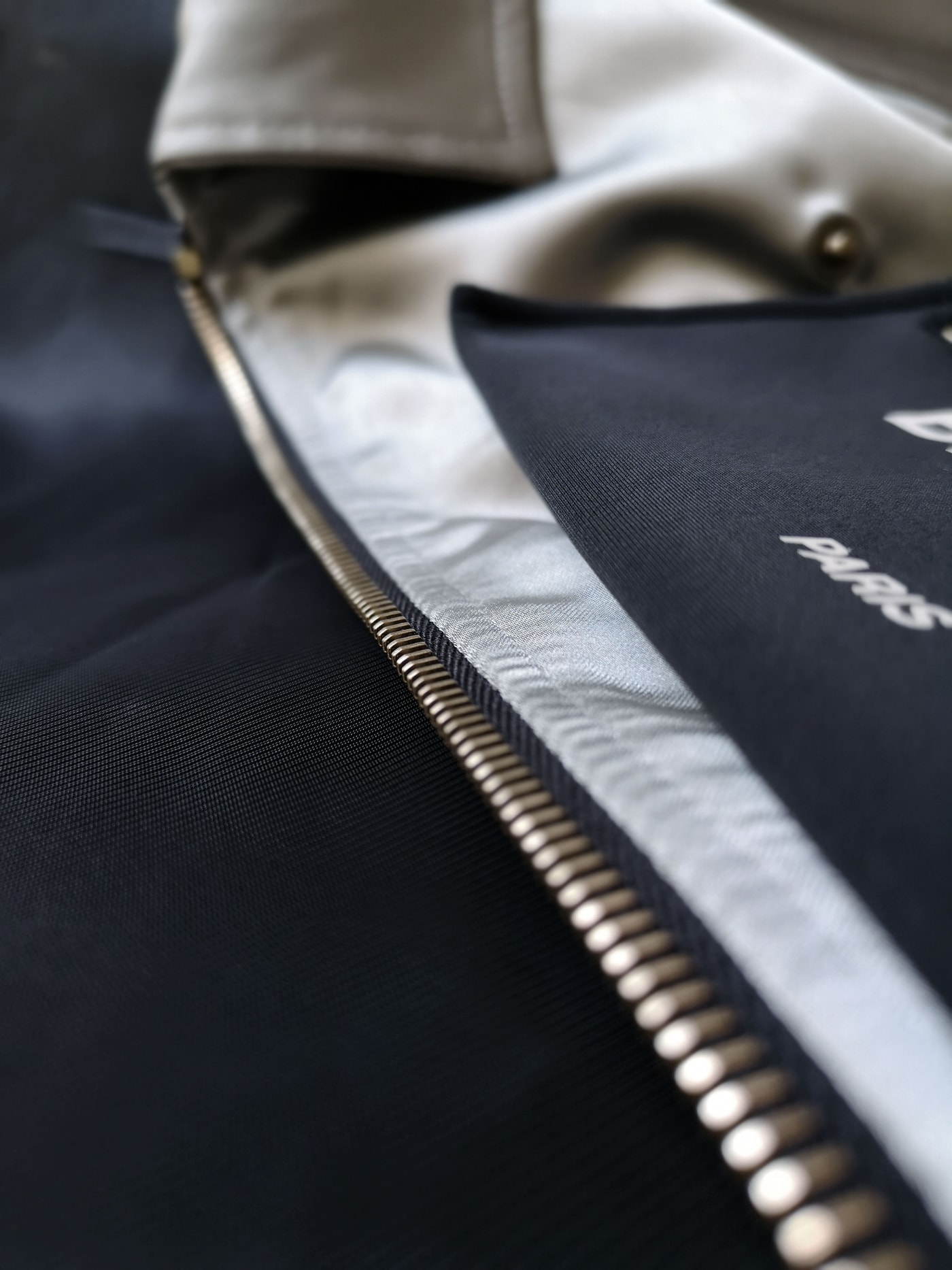 La pièce fonctionnelle se distingue par son élégance. En effet, cette veste en coloris « Smooth Light Green » se sublime grâce aux rayons du Soleil avec des reflets satinés selon son exposition. La caractéristique principale de cette pièce semble se concentrer sur cette pochette amovible au niveau de la poitrine. De plus, on peut remarquer des boutons à pressions avec un Zip Riri.